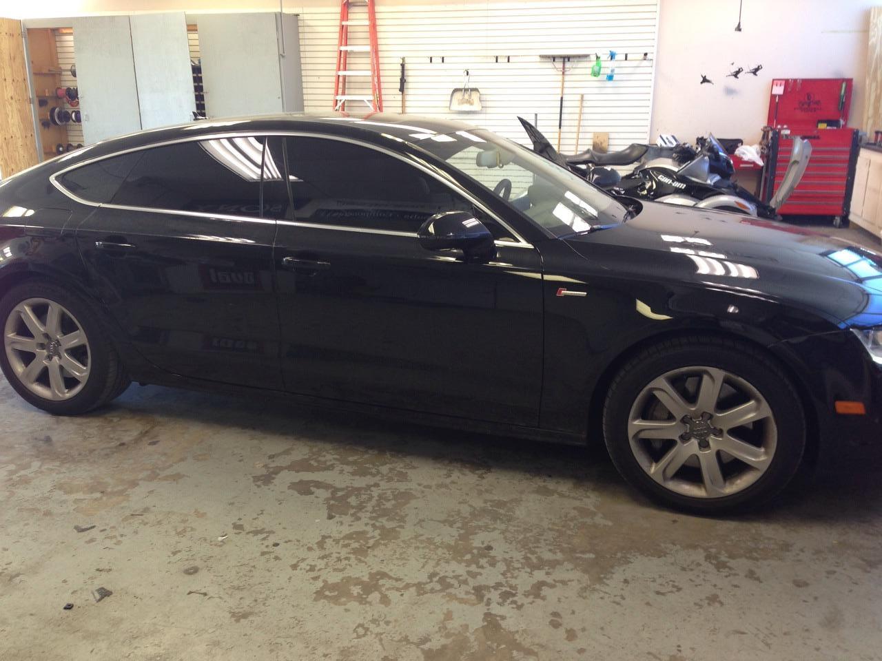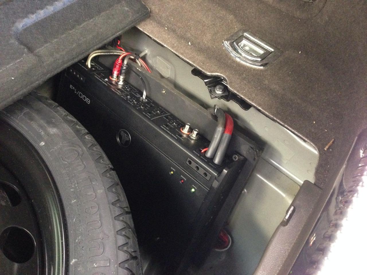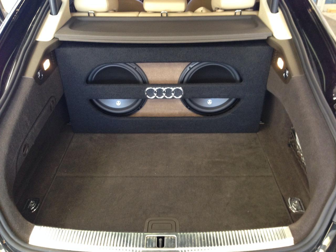 JL Audio 600 watt slash amp is powering up a pair of 12 inch W3 series subwoofers in the hot Audi A7. A custom carpeted box with 2 tone carpet and the Audi logo highlight the trunk area. This was all installed while retaining the factory stereo in the dash. These subs sounded so good and accurate! Awesome ride.