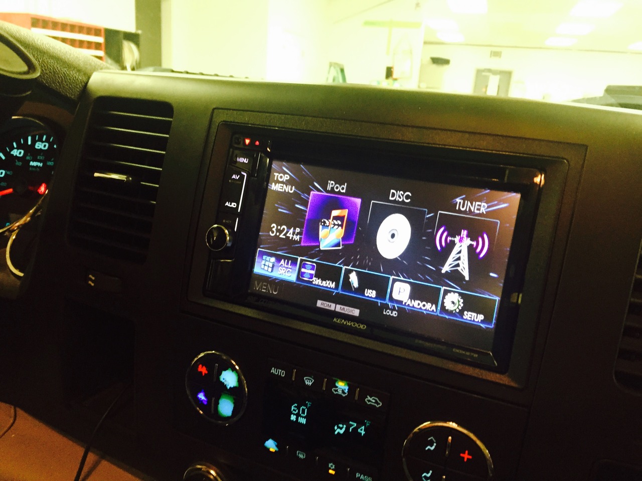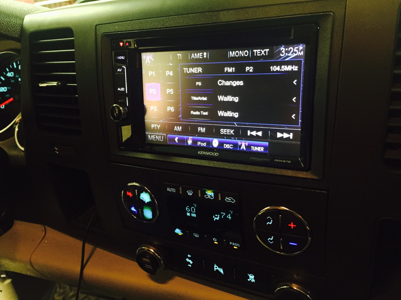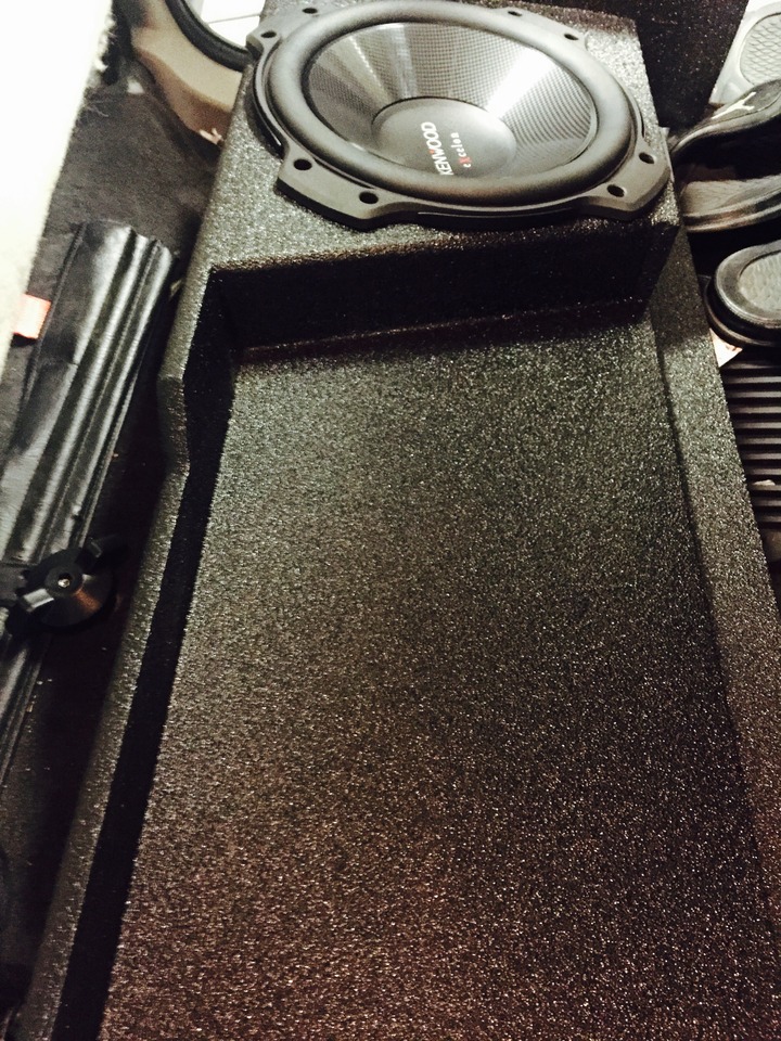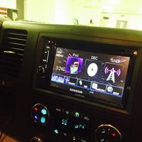 A Kenwood touch-panel radio was installed in this sweet hybrid GMC truck. Also a Kenwood Mono Block amplifier was mounted under the rear seat, and powers up a Kenwood 10 inch sub-woofer. The sub is installed in a ported enclosure built specifically for this vehicle. Everything fits snug under the rear seat so no leg room is lost!