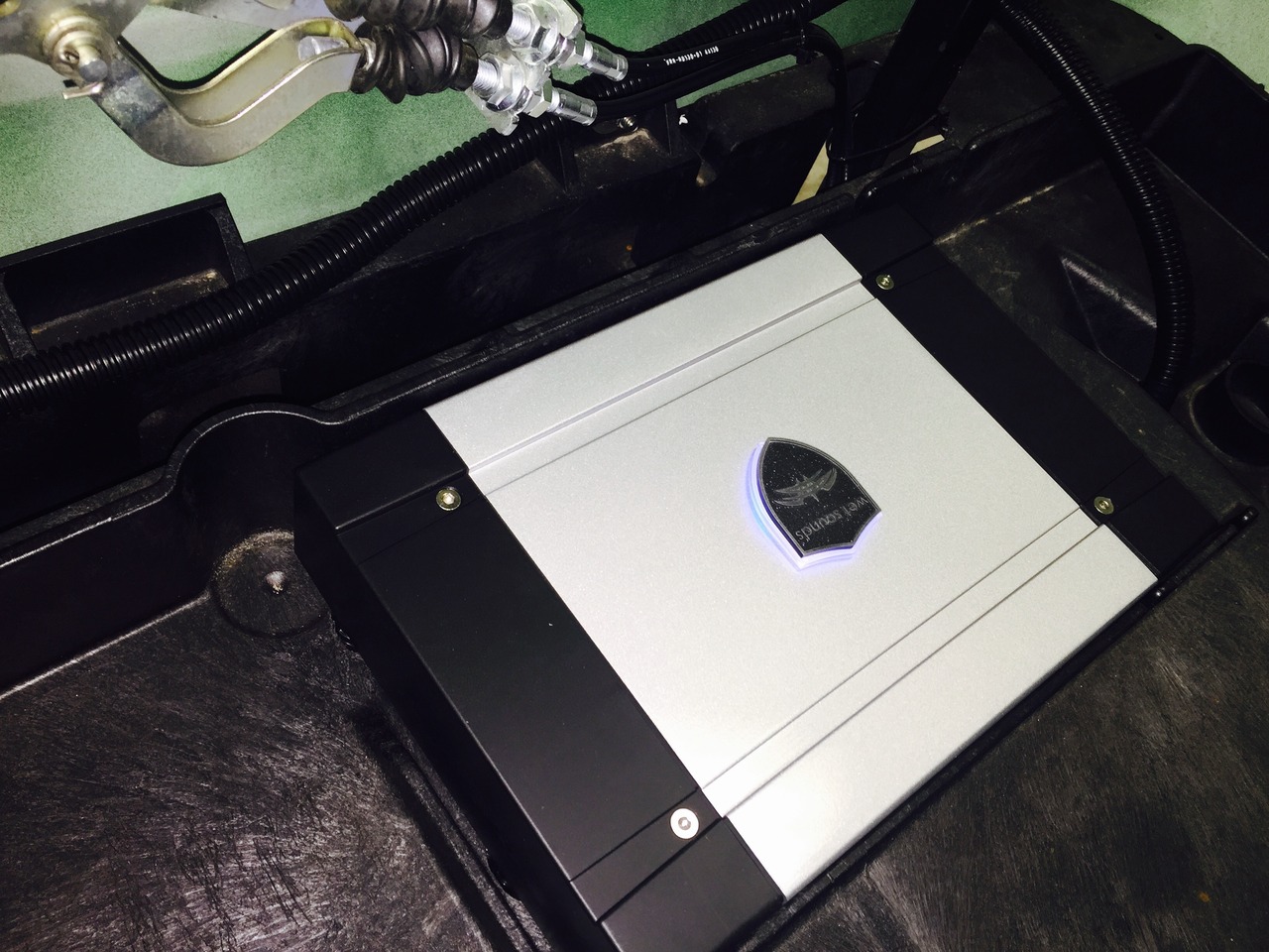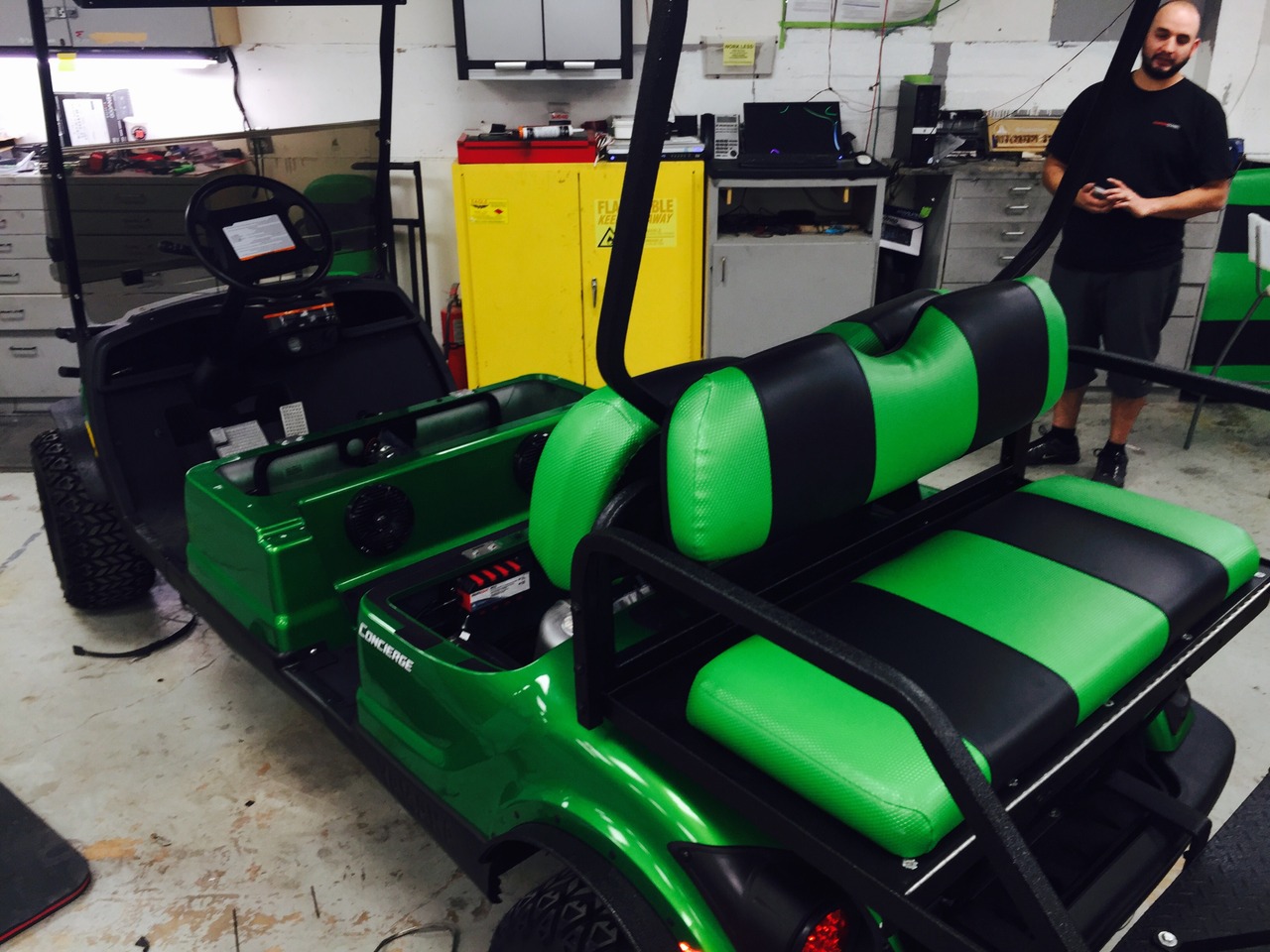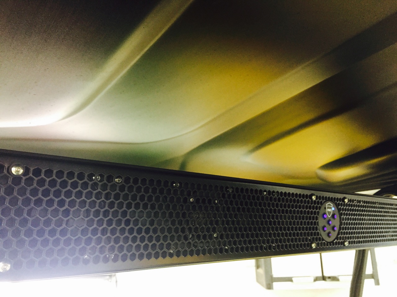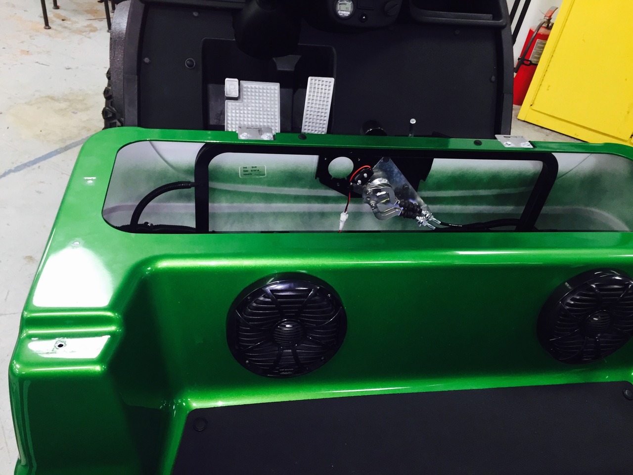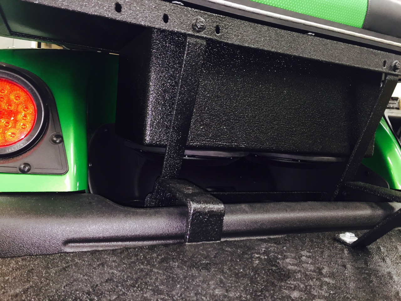 Slick golf cart by Yamaha now has a great sound system with plenty of bass and lots of highs. The stealth10 wet-sounds bar was mounted at the top front of the vehicle for optimized range. Bluetooth audio streams and screams through this system.