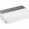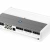 This marine amplifier features white and gray powder-coat finishes, a gasketed cover for the controls and stainless steel hardware for durability in the marine environment.